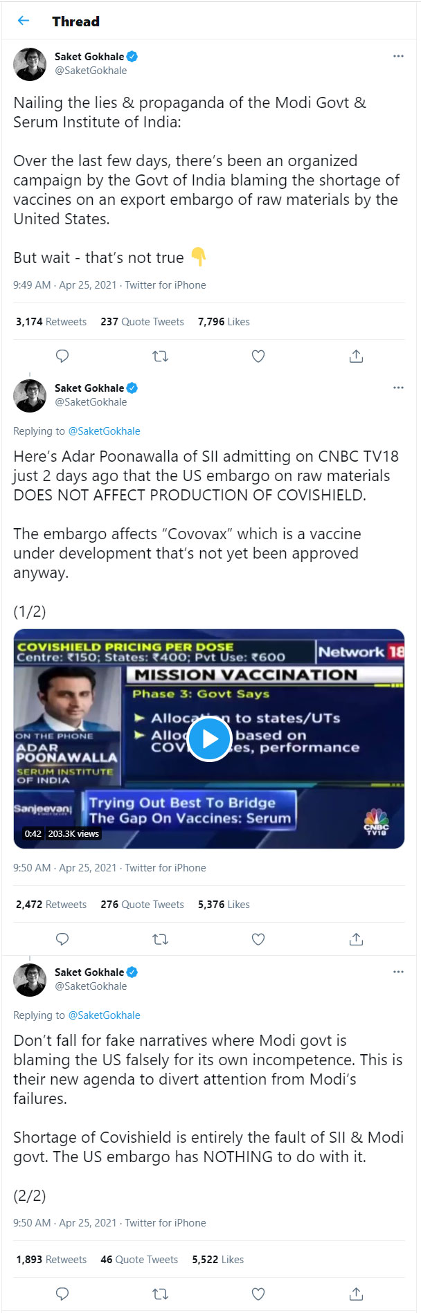 There are some misleading claims that Adar Poonawala had said embargo does not affect the Covidshield production. It only affects the production of Covovax, which is awaiting approval from the government.