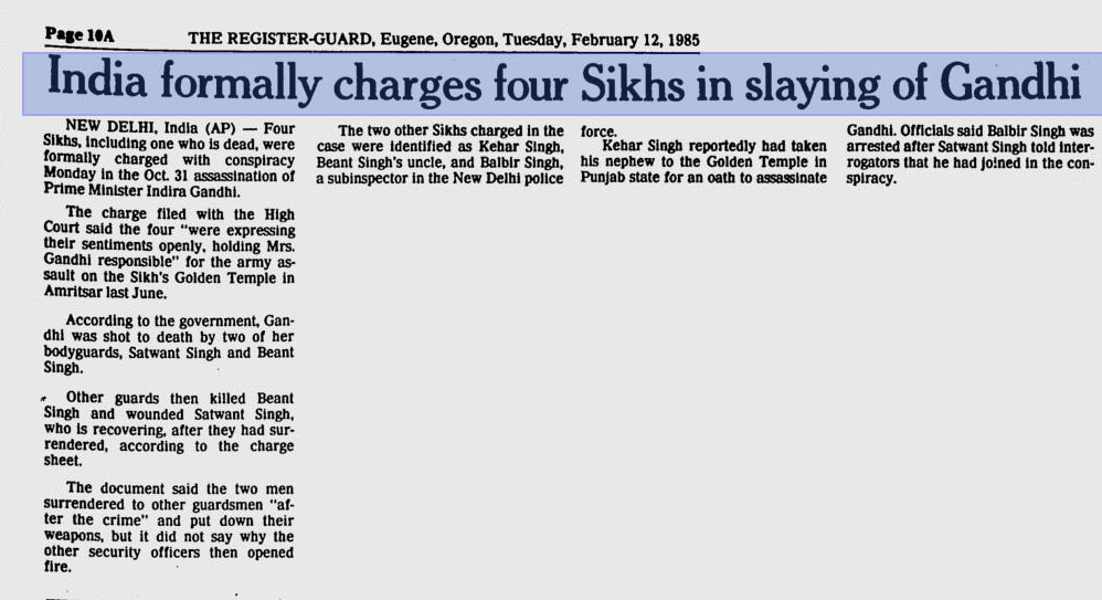 According to a report published in The Register-Guard on February 12, 1985, Kehar Singh, uncle of Beant Singh’s wife, took him to Golden Temple to take an oath to kill Gandhi. The primary evidence against Kehar Singh, who was an assistant in the Directorate General of Supply and Disposal, New Delhi, was Beant Singh’s wife’s testimony.