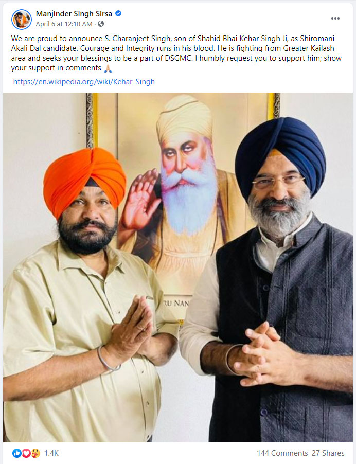 In his post, Sirsa wrote, “We are proud to announce S. Charanjeet Singh, son of Shahid Bhai Kehar Singh Ji, as Shiromani Akali Dal candidate. Courage and Integrity runs in his blood. He is fighting from the Greater Kailash area and seeks your blessings to be a part of DSGMC. I humbly request you to support him; show your support in comments.”