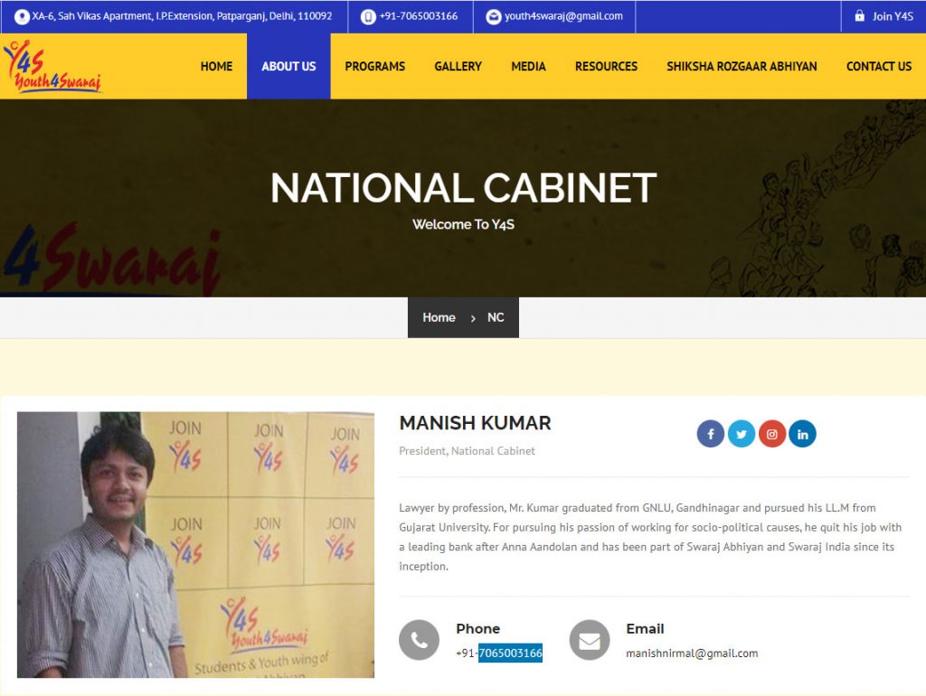 Manish Kumar, President, Youth 4 Swaraj, was also named by one of the victims. It has to be noted that Youth 4 Swaraj is the youth wing of Yogendra Yadav’s Swaraj for India.