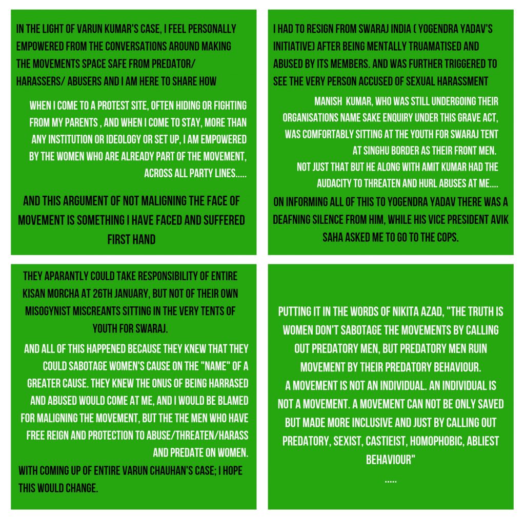 The ongoing farmer protests have been in the news several times for the wrong reasons. In the last three days, allegations of sexual assault against activists associated with the protests have clouded the protests further. The allegations started with a post against one Mohammad Zuber (_emmzedd on Instagram) and opened a Pandora’s Box of many such allegations on other alleged activists. Other prominent activists who have been named so far are Varun Chouhan (member of Trolly Times), Antarpreet Singh (leader of Students For Society) and Manish Kumar (President, Swaraj For Youth).