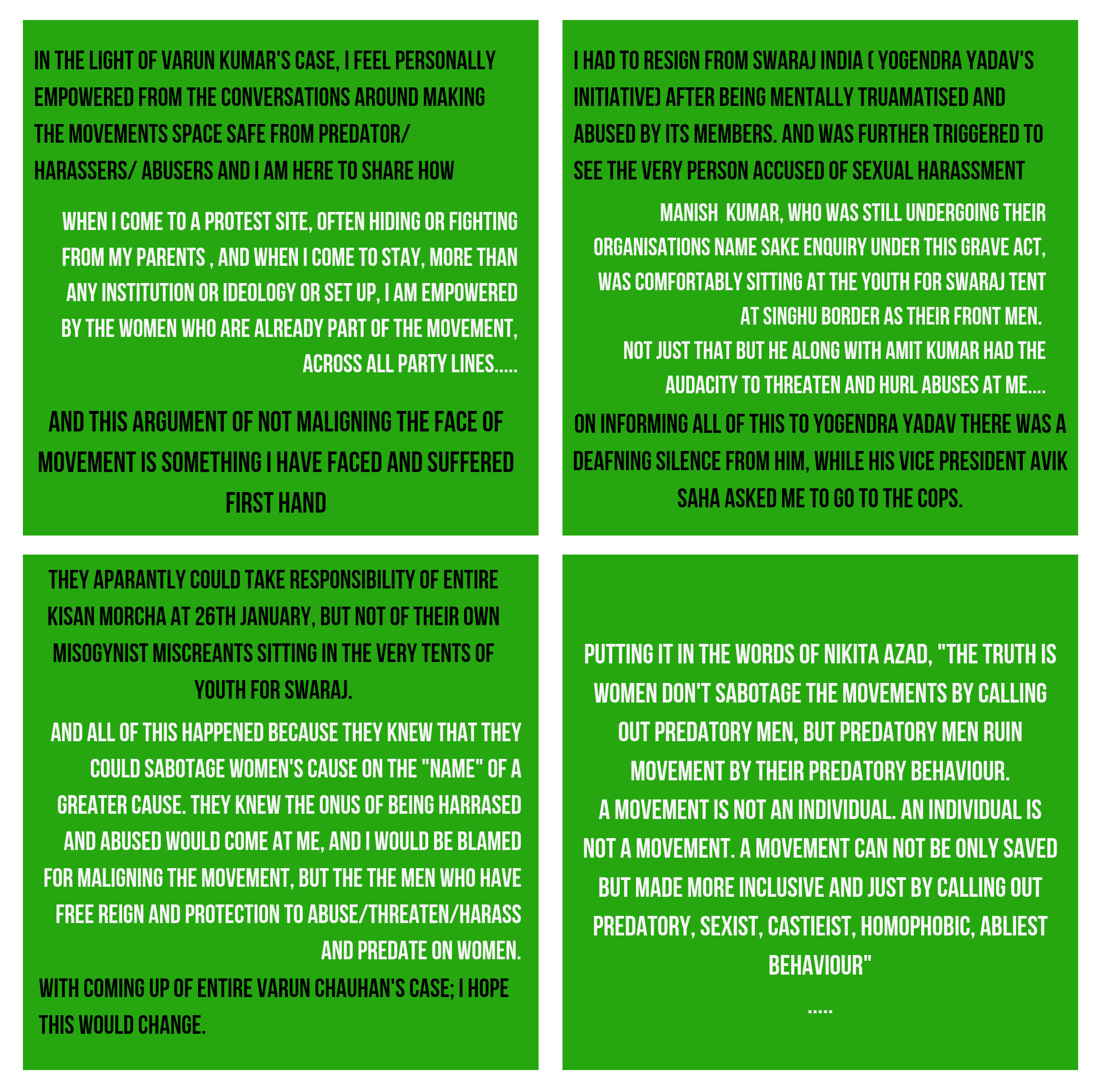 She added that it was traumatising for her that even after telling the senior members about Manish Yadav’s actions, he was comfortably sitting at Youth for Swaraj’s tent at Singhu border as one of their front men.