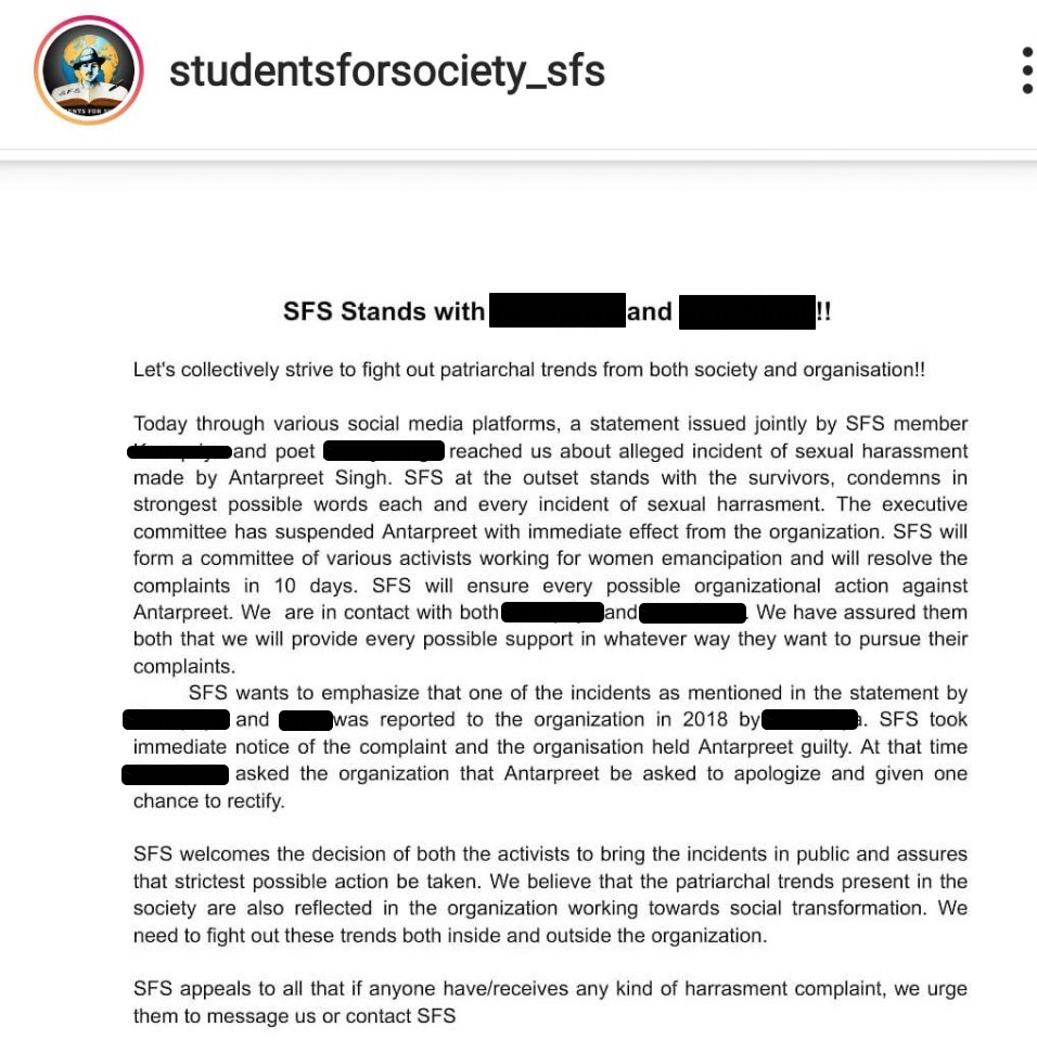 In its reply to the allegations, SFS said that they stand with the victims. “SFS at the outset stands with the survivors, condemns in strongest possible words each and every incident of sexual harassment. The executive committee has suspended Antarpreet with immediate effect from the organisation,” they said in the statement.