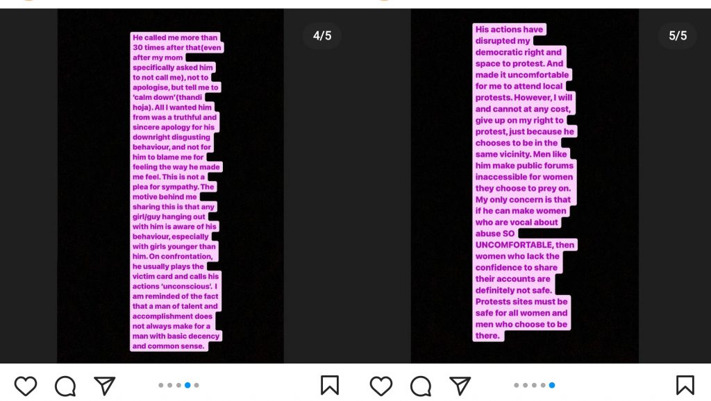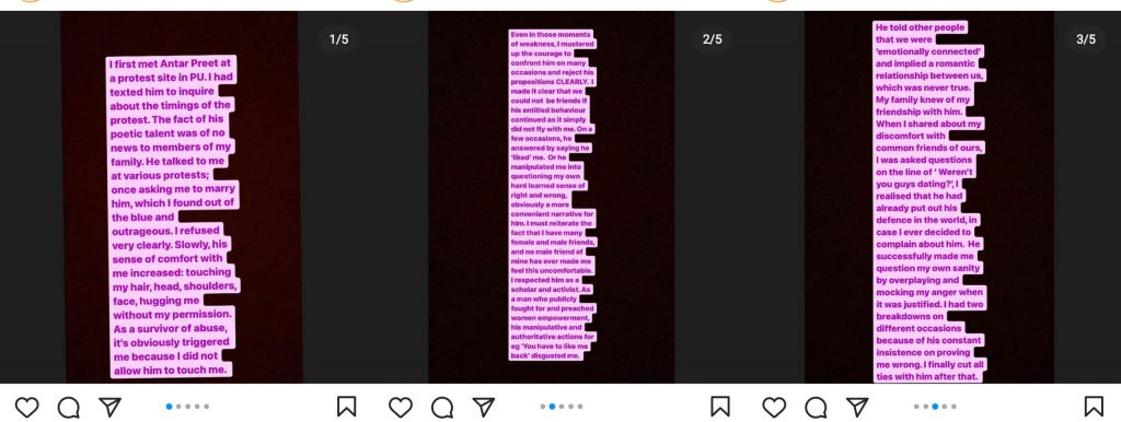 Another victim, in her post narrating her ordeal with Antarpreet, said that she met him at PU. They regularly met during different protests and had conversations. He once asked her to marry him out of the blue, which she found to be outrageous. Slowly, he started to touch her hair, shoulders, face and hug her without permission. Though she confronted him on several occasions, he continued his actions.