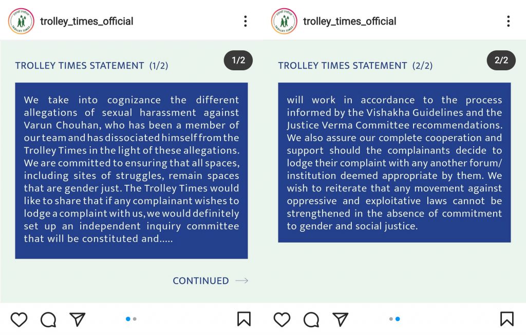 In a post on April 5, they said, “We take into cognisance the different allegations of sexual harassment against Varun Chouhan, who has been a member of our team and has dissociated himself from the Trolley Times in the light of these allegations. We are committed to ensuring that all spaces, including sites of struggles, remain spaces that are gender just. The Trolley Times would like to share that if any complainant wishes to lodge a complaint with us, we would definitely set up an independent inquiry committee that will be constituted and will work in accordance with the process informed by the Vishakha Guidelines and the Justice Verma Committee recommendations. We also assure our complete cooperation and support should the complainants decide to lodge their complaint with any other forum/institution deemed appropriate by them. We wish to reiterate that any movement against oppressive and exploitative laws cannot be strengthened in the absence of commitment to gender and social justice.“