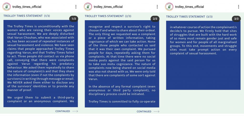 Trolley Times is committed to fully co-operate in whatever course of action the complainant/s decide/s to pursue. We firmly hold that sites of struggles that are built with the hard work of so many must remain gender just and safe for women and for people of all marginalised groups. To this end, movements and struggle sites must take prompt action on every complaint of sexual harassment.“