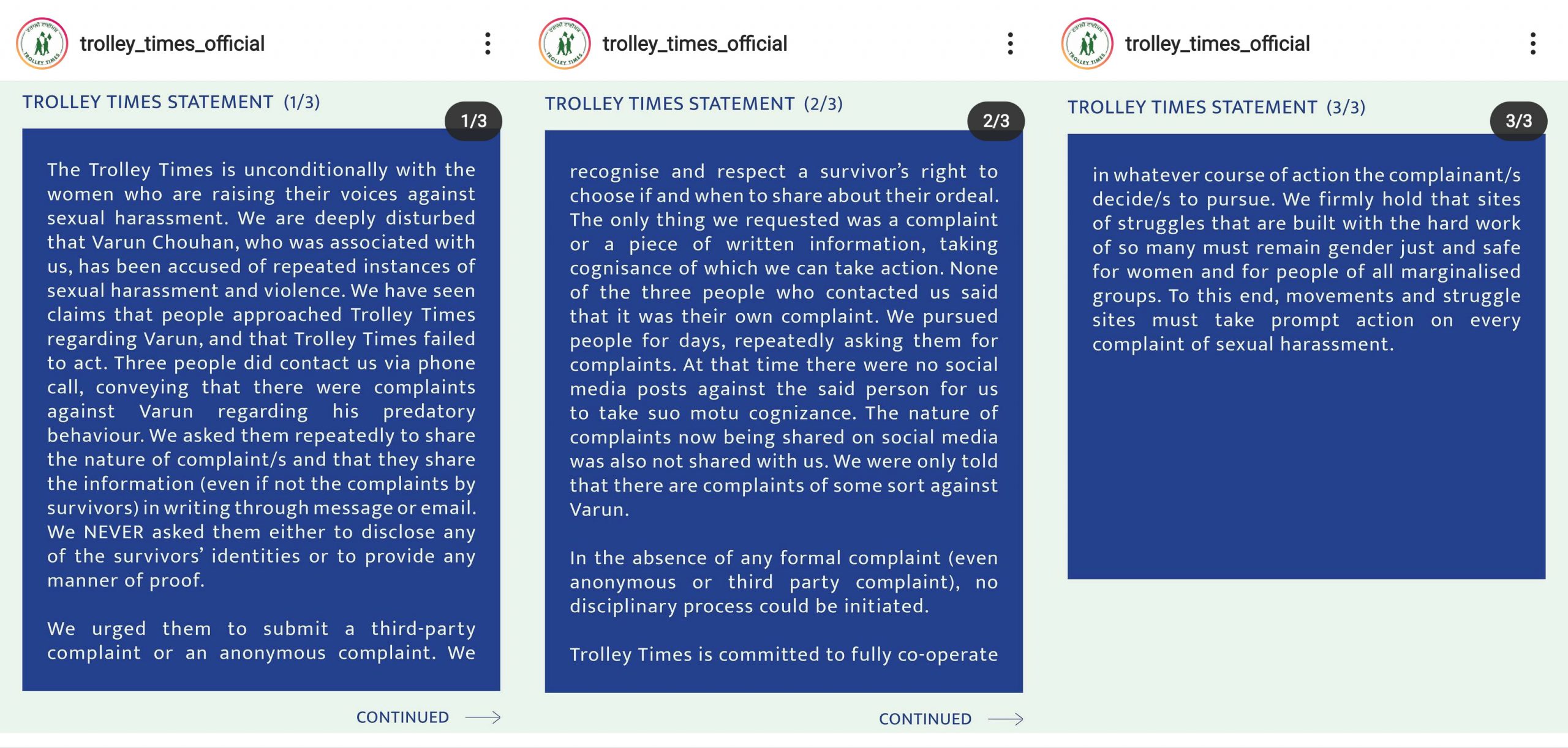 Later on April 5, they said that they are unconditionally with the victims, but they cannot take any action against Varun in lack of an official complaint. They said, “The Trolley Times is unconditionally with the women who are raising their voices against sexual harassment. We are deeply disturbed that Varun Chouhan, who was associated with us, has been accused of repeated instances of sexual harassment and violence. We have seen claims that people approached Trolley Times regarding Varun, and that Trolley Times failed to act. Three people did contact as via phone call, conveying that there were complaints against Varun regarding his predatory ) behaviour. We asked them repeatedly to share the nature of complaint/s and that they share the information (even if not the complaints by survivors) in writing through message or email. We NEVER asked them either to disclose any of the survivors’ identities or to provide any manner of proof.