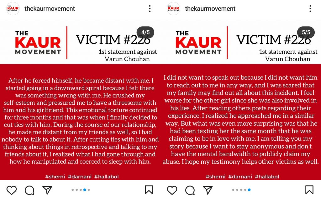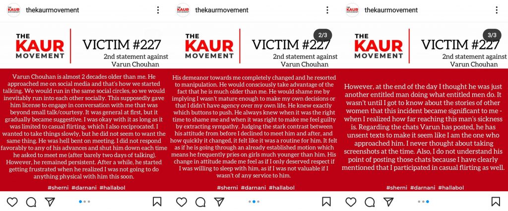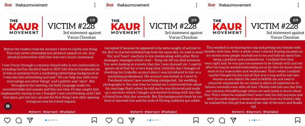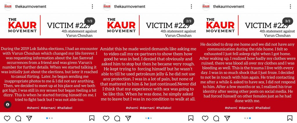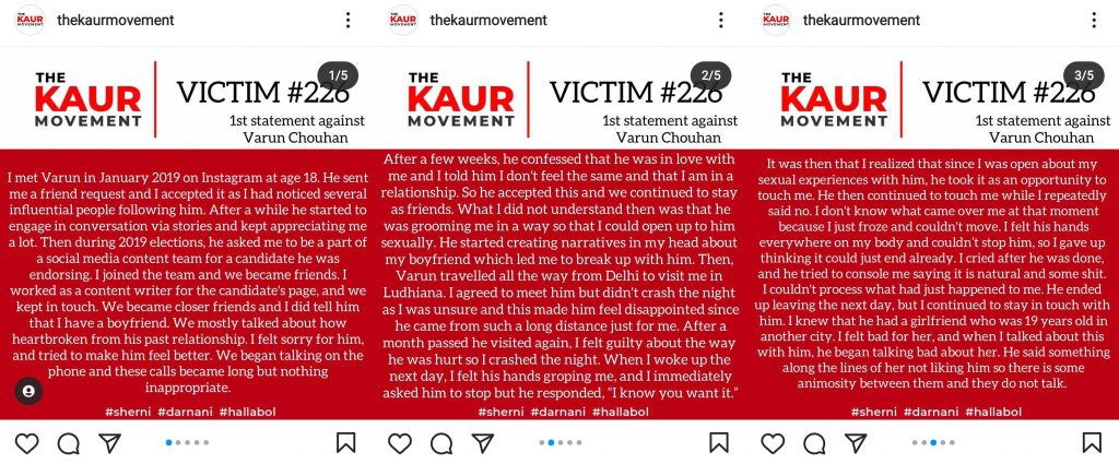 Varun Chouhan has been actively covering Farmer Protests under Trolley Times. So far, he has been named by four different victims. After he was accused of sexually assaulting a victim, “The Kaur Movement” took the initiative to publish stories on behalf of the victims. The Kaur Movement has not published any names of the victims to ensure their privacy.