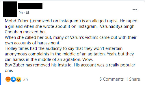 So far, we only know that some girl had posted on Instagram where she alleged Mohd Zuber had raped her. After her post, Zuber deleted or deactivated his Instagram account and disappeared from social media. However, his Twitter handle is still active. A girl on Facebook had posted about Zuber and said, “Mohd Zuber (_emmzedd on Instagram ) is an alleged rapist. He raped a girl, and when she wrote about it on Instagram, Varunaditya Singh Chouhan mocked her.”