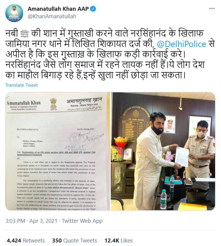 On April 3, an FIR was registered by Delhi Police based on the complaint of Amanatullah Khan in which he had alleged that Yati Narsinghanand Saraswati used derogatory language against Prophet Muhammad. In a now-removed-tweet, Khan had asked for Yati Narsinghanand Saraswati’s beheading. The provocative tweet against Twitter Rules, remained online for hours despite countless requests to remove it.