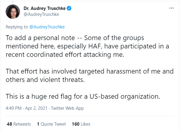 No, @AudreyTruschke, as a board member of HAF, I can confirm that your name was never discussed as part of a coordinated attack, nor ever been brought up at the board level. Any such accusations are defamatory. It’s actually you who has been involved in targeted harassment. (1/3) pic.twitter.com/XeRVGhHsBn