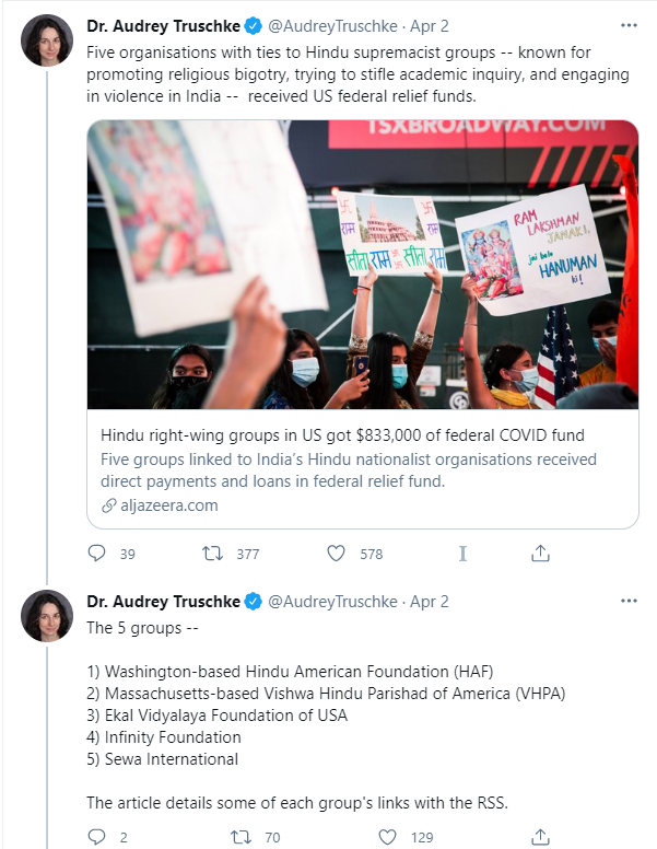 On Friday (April 2), controversial ‘historian’ Audrey Truschke shared an article published by Aljazeera, wherein it claimed that 5 organisations have received US federal relief funds to the tune of $833,000. The article alleged that the organisations have links to ‘Hindu supremacist groups’.