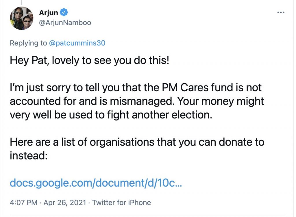 Arjun Namboothiri, an ESPN journalist based in Bengaluru, was quick to utilize his verified check mark on Twitter to baselessly allege that the PM Cares Fund is somehow “mismanaged”. Not only that, Namboothiri then went on to link a Google Doc, ungratefully asking Cummins to donate to organizations listed in the Google doc, instead of the PM Cares Fund.