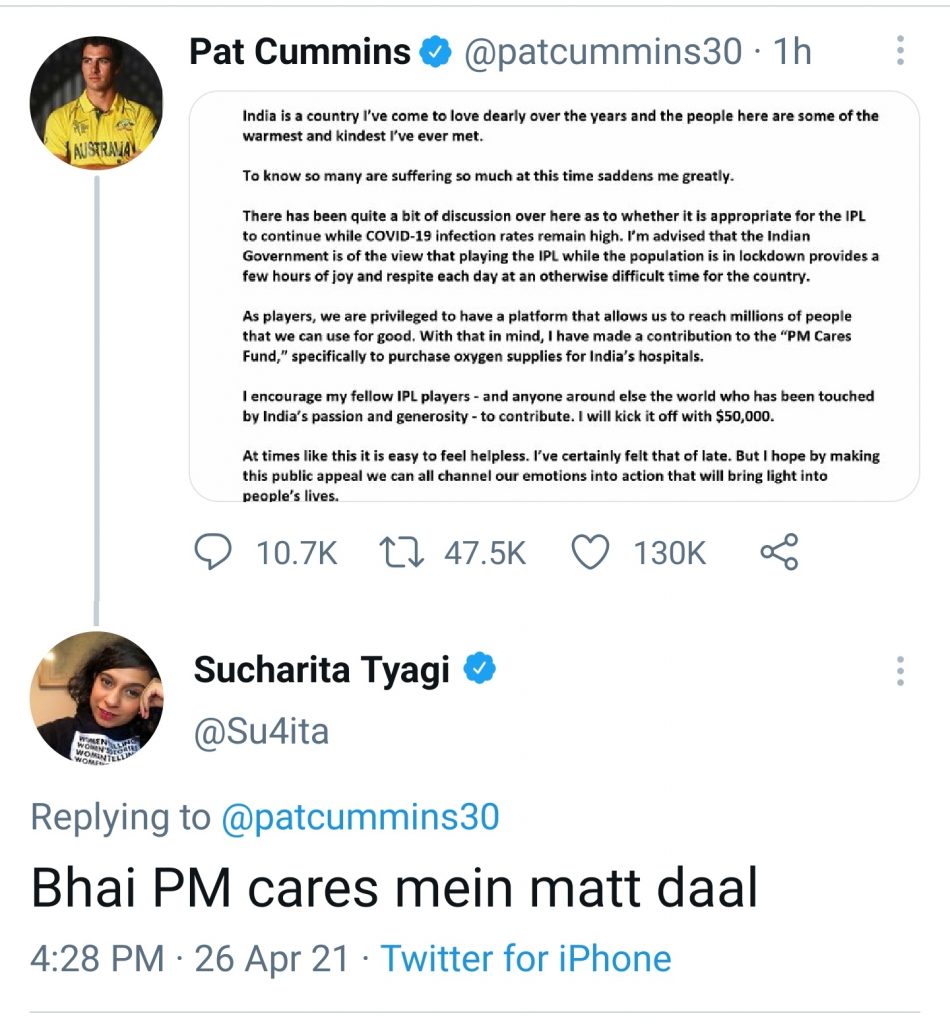 Sucharita Tyagi, a small YouTuber who reviews movies and somehow is verified on Twitter, also felt the need of making her sentiments known by urging Cummins to not donate to the PM Cares Fund. She later deleted her tweet.