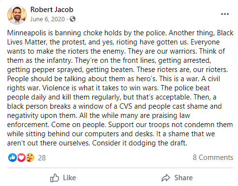 “Everyone wants to make the rioters the enemy. They are our warriors. Think of them as the infantry. They’re on the front lines, getting arrested, getting pepper sprayed, getting beaten. These rioters are, our rioters. People should be talking about them as hero’s. This is a war. A civil rights war. Violence is what it takes to win wars.” wrote Jacob on Facebook.