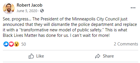 In another Facebook post, Jacob advocated for “defunding the police”. “Defunding is about re-funding,” he wrote on Facebook. “Defund the police to re-fund the resources we’ve been slashing for generations.” Jacob also praised the Minneapolis city council’s commitment to dismantle its police department, which resulted in an upward spike of violent crime in Minneapolis, and the hiring of more police officers.