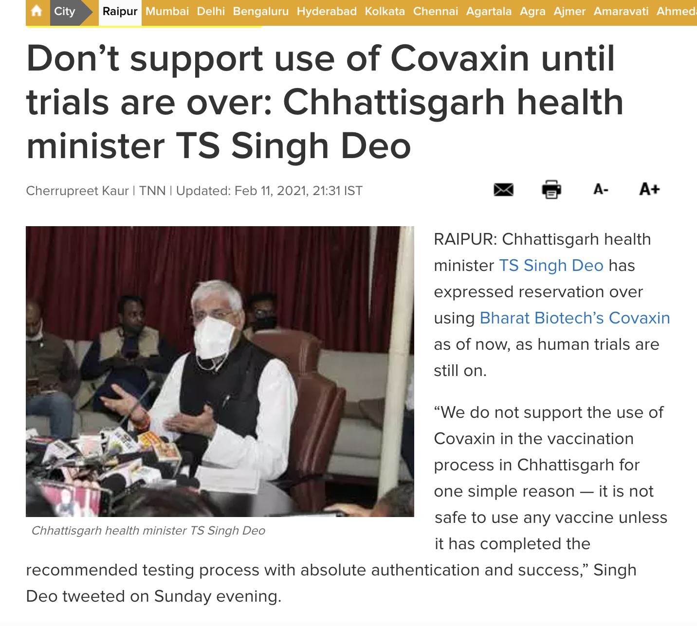 In February 2021, Deo had said he does not support use of Covaxin, one of the two vaccines which were approved for emergency use then, in Chhattisgarh. Chief Minister Baghel, too, had cast aspersions on the safety of the Covaxin and indulged in fear-mongering. He was recently called out by Union Health Minister Dr Harshvardhan in his letter to former PM Dr Manmohan Singh. Without naming Baghel, Dr Harshvardhan had said, “A sitting Chief Minister of your party created a dubious world record of sorts by being the only head of government directly inciting people against an indigenously developed vaccine.”