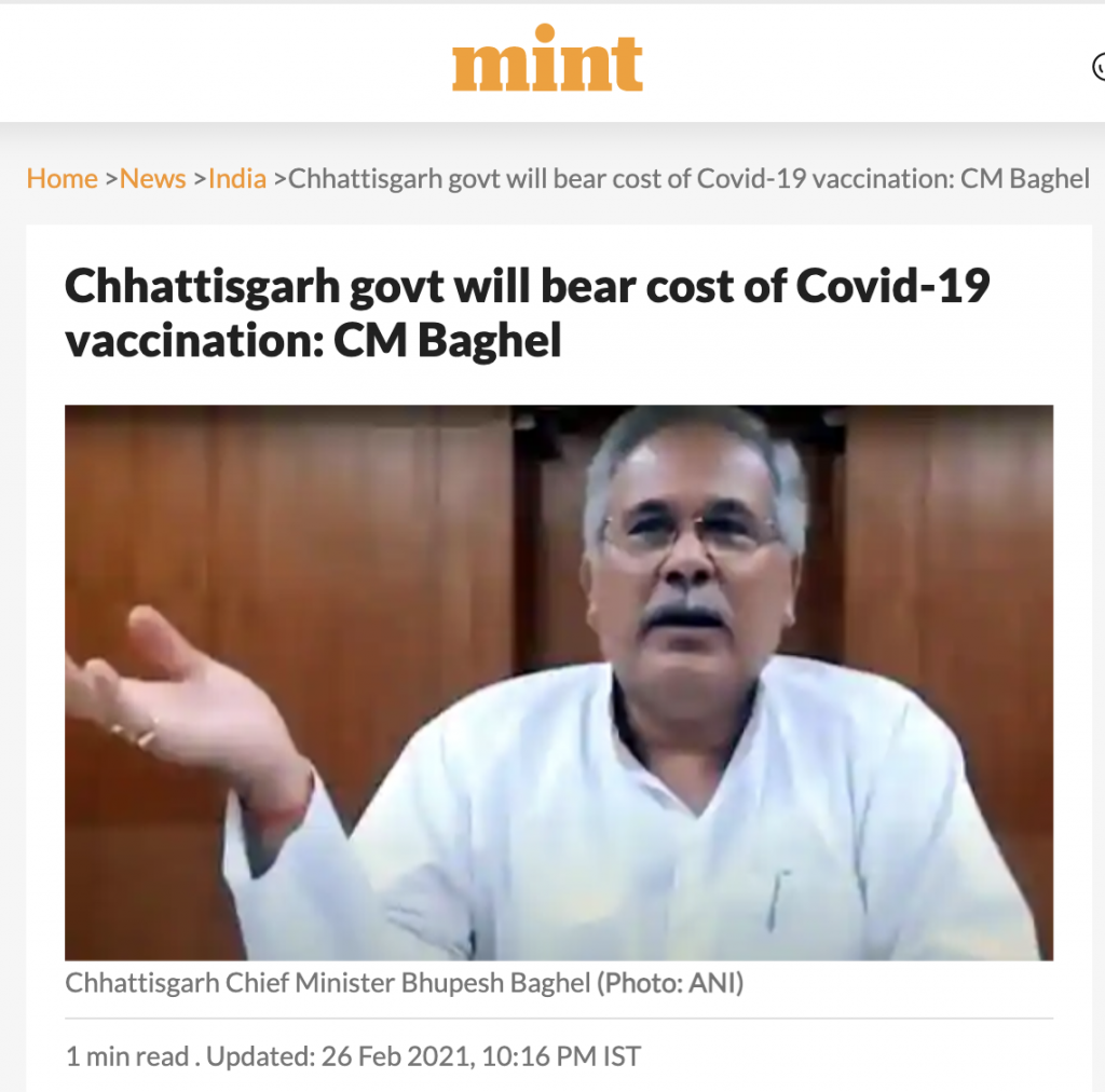 In February 2021, Baghel had said that the Chhattisgarh government will bear the cost of COVID-19 vaccines in Chhattisgarh even if Centre refuses to do the same. “We don’t have a dearth of funds. We have kept (funds) for it,” he had reportedly said on the floor of state assembly. If the Union government refuses (to provide free vaccine to all), then we would facilitate COVID vaccination of people in the state at our own expenses,” Baghel had said.