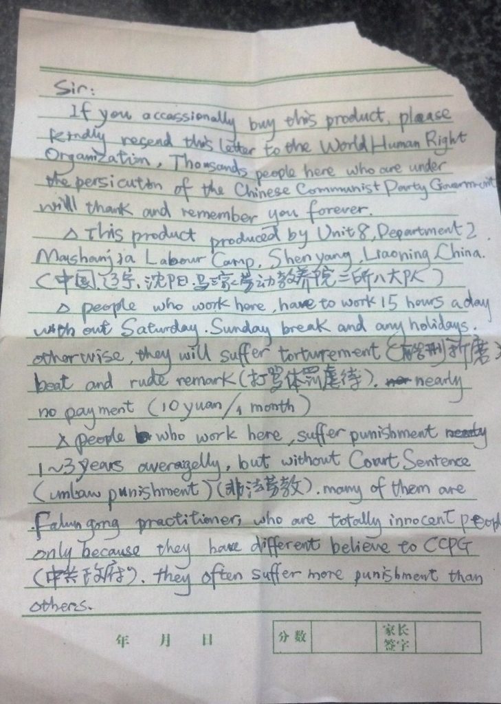 In broken English mixed with Chinese, the letter read, “If you occasionally (sic) buy this product, please kindly resend this letter to the World Human Right Organization. Thousands people here who are under the persicution (sic) of the Chinese Communist Party Government will thank and remember you forever.”