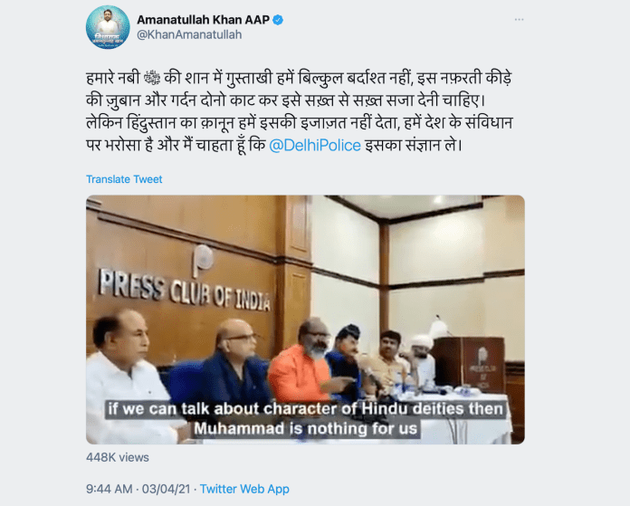 AAP MLA Amanatullah Khan had also issued a death threat calling for his beheading for the same. In a tweet, Khan said, “We can not tolerate such impertinence for our beloved Prophet Muhammad. This hateful insect should be awarded the most severe punishment by slitting his tongue and neck. But the law of the land does not permit us to do this, we have faith in the Indian constitution, and I want Delhi Police to take note of this.”