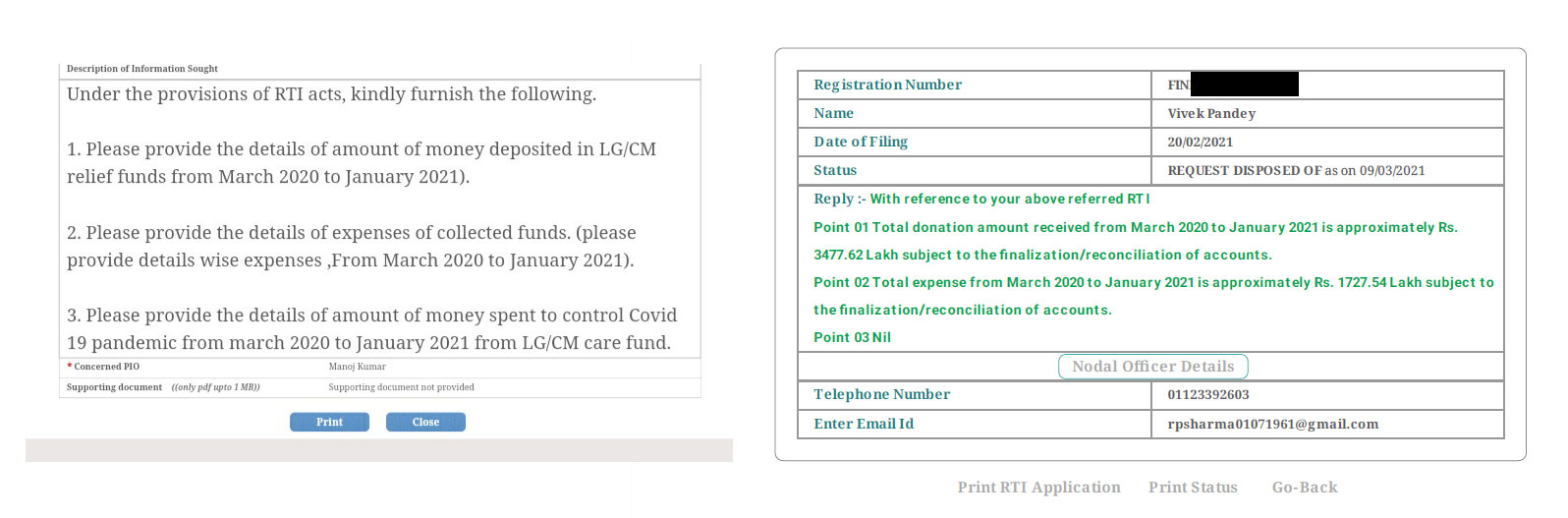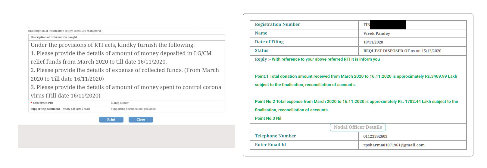 RTI applications were filed by RTI activist Vivek Pandey. Speaking to OpIndia, Vivek informed that he filed two RTI applications with Delhi Government to get information on funds collected under CM/LG relief fund since March 2020 and how it was utilised.