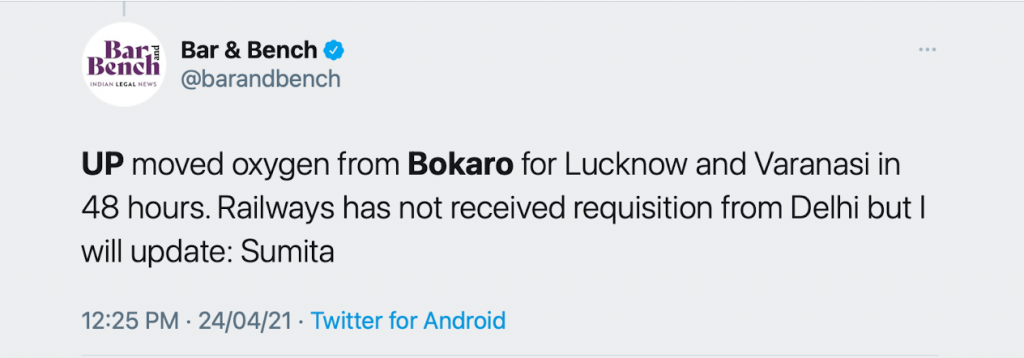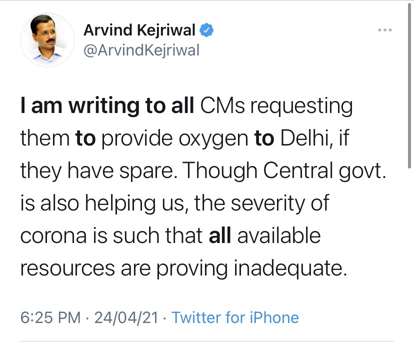 He continued posting tweets on Twitter, feigning concern that he is greatly invested in solving the oxygen crunch faced by the city’s numerous hospitals. Delhi CM Arvind Kejriwal posted a tweet, asking chief ministers of other states to supply oxygen to Delhi if they have in spare. The court had asked his government to figure out the transportation of oxygen from different places to Delhi’s hospitals, but the AAP chief was busy scoring political points on social media.