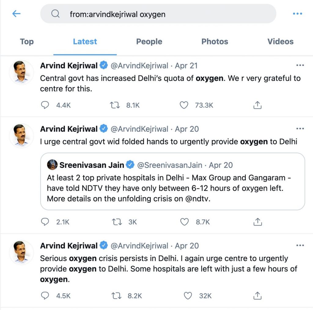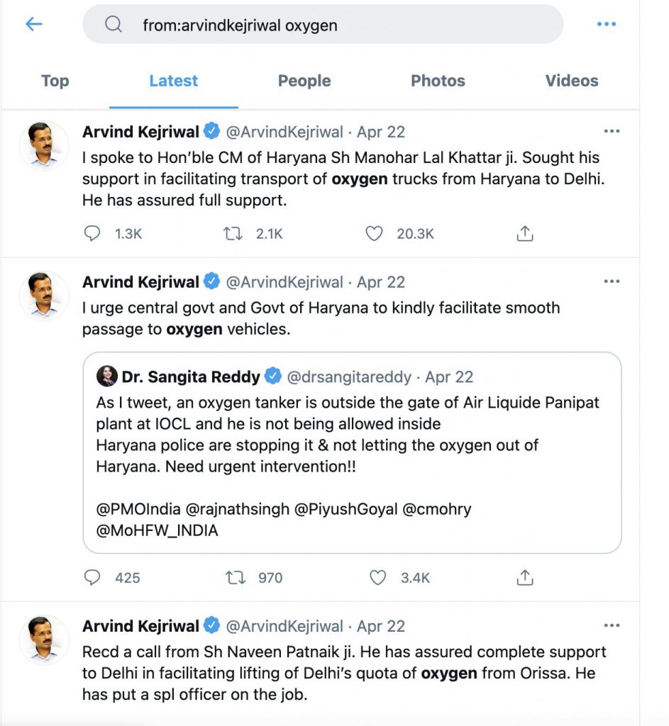 Here are the tweets, Kejriwal posted on Twitter requesting for oxygen:-