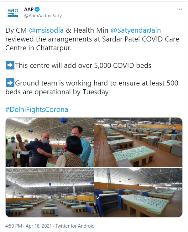 In a tweet, Sisodia said, “This Centre will add over 5,000 beds for Corona patients. Our teams are working hard to ensure at least 500 beds to be operational by Tuesday.”