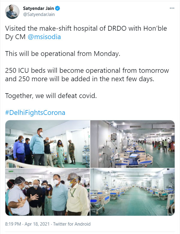 Jain also tweeted on similar lines and said, “Visited the make-shift hospital of DRDO with Hon’ble Dy CM @msisodia. This will be operational from Monday. 250 ICU beds will become operational from tomorrow, and 250 more will be added in the next few days.”