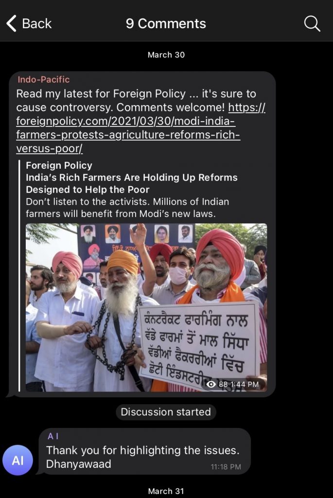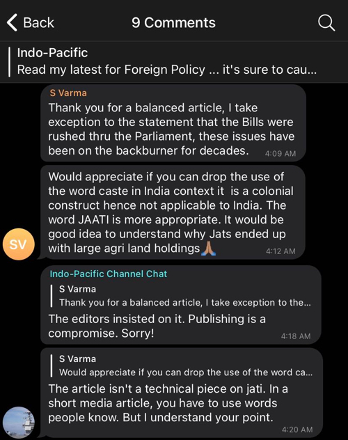 When OpIndia joined the writer’s Telegram channel, we found a message in the group by the same columnist. He wrote, “Read my latest for Foreign Policy…it’s sure to cause controversy. Comments welcome!” While complimenting him for striking a balance, another user S Verma said, “Thank you for a balanced article. I will take exception to the statement that the Bills were rushed through the Parliament. These issues have been on the backburner for several years.”