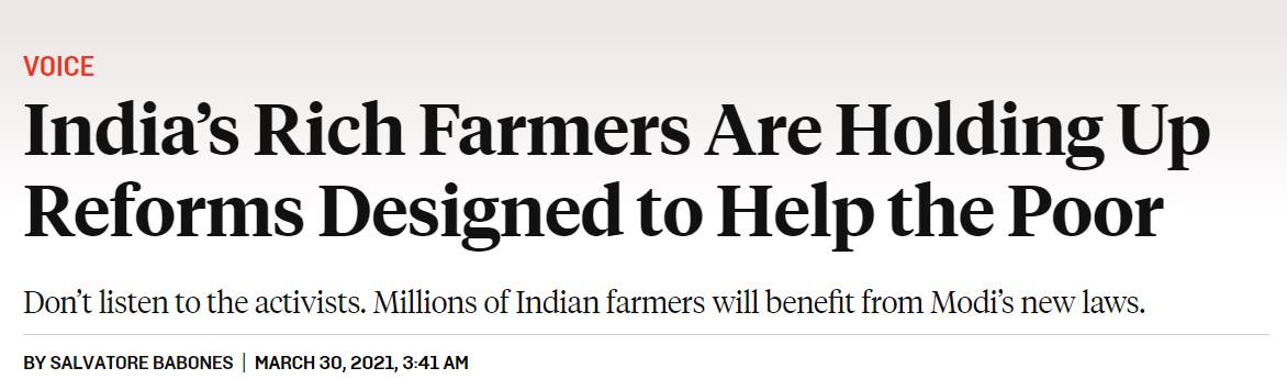 On Tuesday (March 30), FP posted an article titled, “India’s Rich Farmers are Holding Up Reforms Designed to Help the Poor.” While the article debunked most of the Western propaganda about farm laws, the columnist Salvatore Babones cast aspersions about the manner in which the farm laws were passed in the Indian Parliament. “Rammed through the Indian Parliament in September on voice votes with little opportunity for a proper legislative scrutiny, the three bills sparked pandemonium in the upper house,” the article claimed.