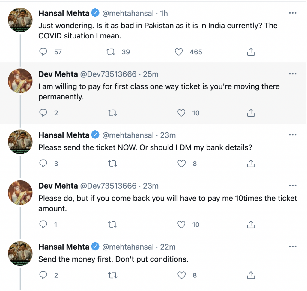 To this, a netizen was quick to offer a first class one way ticket to Pakistan if Mehta agreed to move out of the country permanently since he considered the situation in our neighboring country to be better.