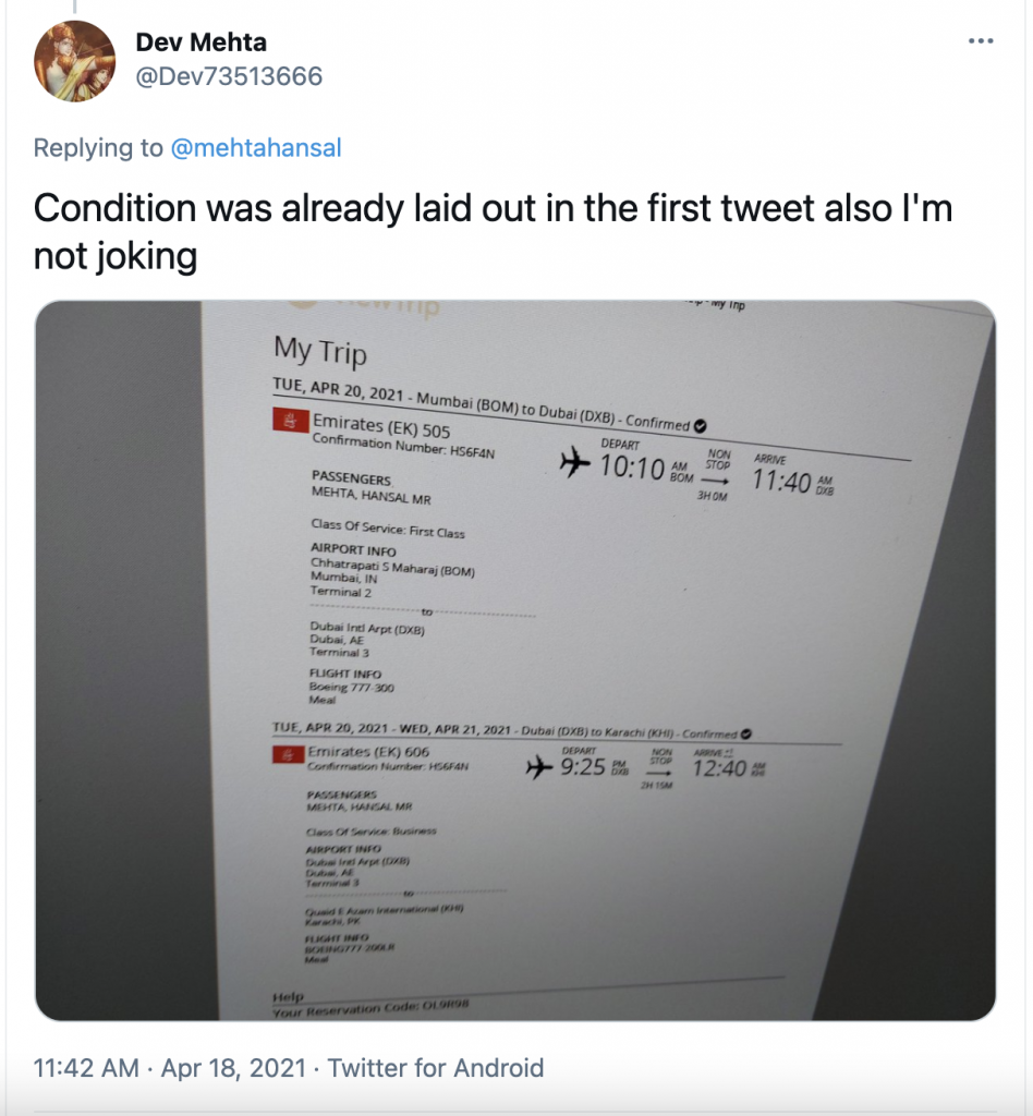 To everyone’s surprise, the user actually booked the ticket from Mumbai to Dubai and Dubai to Pakistan for the 20th of April under Hansal Mehta’s name.