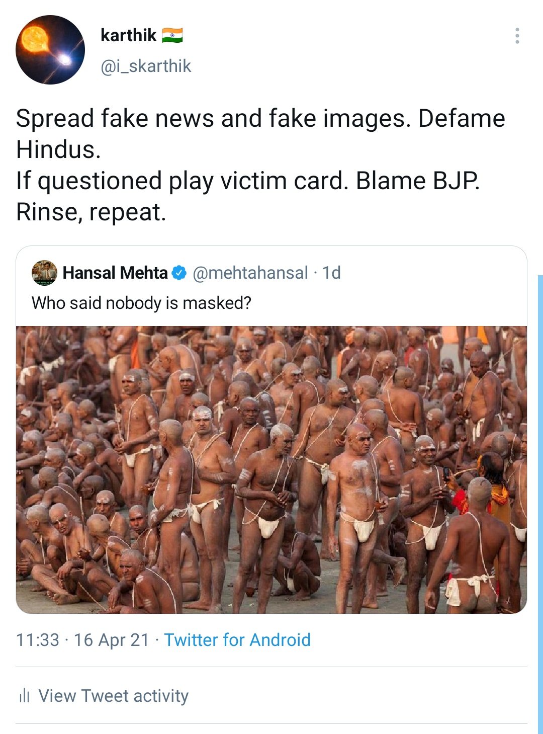 Speaking the language of the left media, Hansal Mehta the famed filmmaker shared an old image of the Kumbh Mela’s congregation and mocked the sadhus.