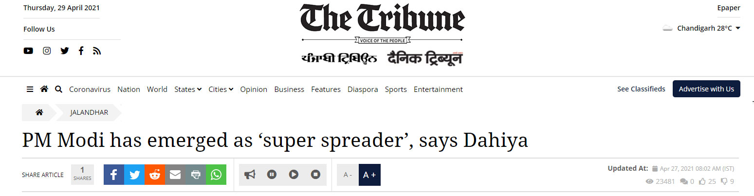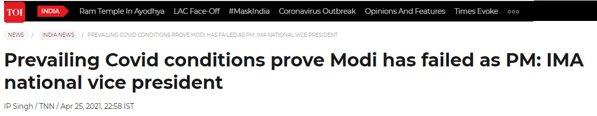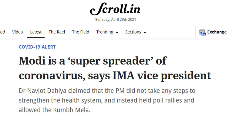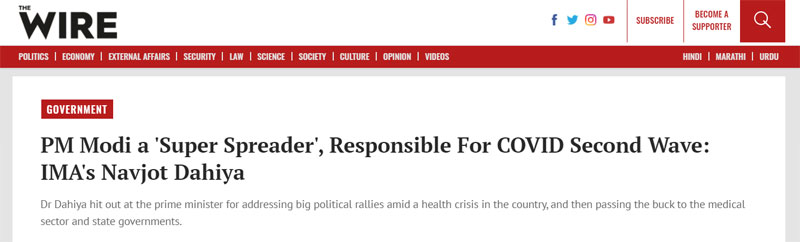 On April 27, many left-leaning media houses, including The Wire, The Scroll, The Week, and others, quoted Indian Medical Association’s National Vice President Dr. Navjot Singh Dahiya and called PM Modi a ‘super spreader’ of Covid-19. The quote of Dr Dahiya was based on an April 25 interview in the Times of India.