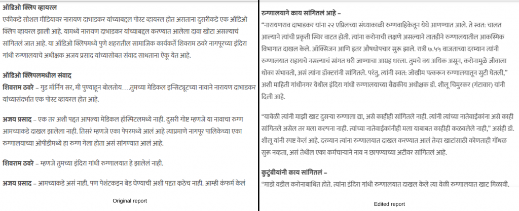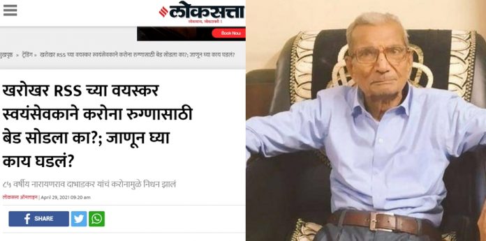 Loksatta then quietly edited its report and quickly added a statement by Anil Sambre, the Vidarbha region campaign chief of the Rashtriya Swayamsevak Sangh to validate Dhabadkar’s sacrifice. The statement said, “The incident involving our senior RSS volunteer Narayanrao Dabhadkar is true. He begged the hospital to discharge him, give his bed to others, and be allowed to go home. However, Dabhadkar is being deliberately misrepresented on social media by some people.”
