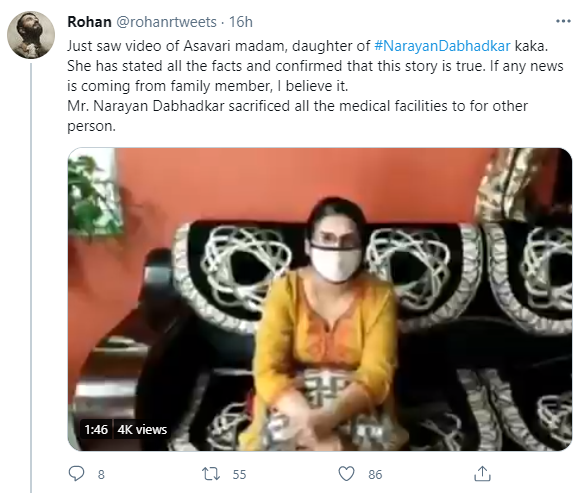 Replugging Asawaree Dhabadkar, Narayan Dhabadkar’s daughter’s video narrating the actual incidence, he wrote, “Just saw video of Asavari madam, daughter of #NarayanDabhadkar kaka. She has stated all the facts and confirmed that this story is true. If any news is coming from family member, I believe it. Mr. Narayan Dabhadkar sacrificed all the medical facilities to for other person.”