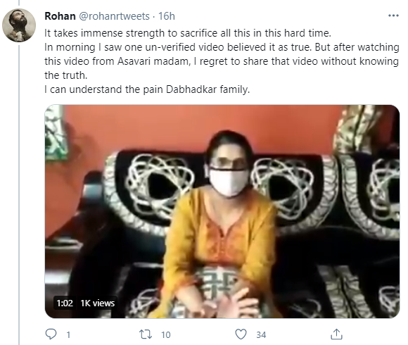 “It takes immense strength to sacrifice all this in this hard time. In morning I saw one un-verified video believed it as true. But after watching this video from Asavari madam, I regret to share that video without knowing the truth. I can understand the pain Dabhadkar family,” he continued in another Tweet.