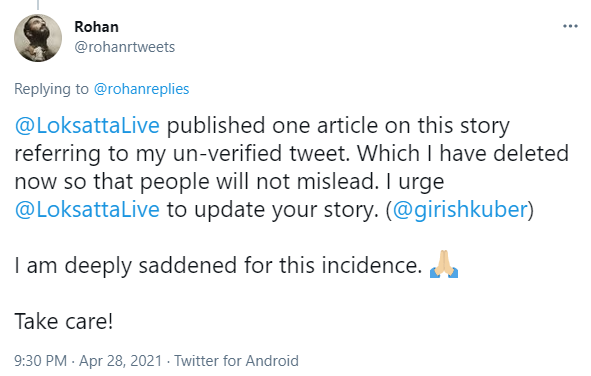 The Twitter user ‘rohanrtweets’ confessed to Loksatta publishing an article based on his unverified video and requested them to update their story. His Tweet reads, “@LoksattaLive published one article on this story referring to my un-verified tweet. Which I have deleted now so that people will not mislead. I urge @LoksattaLive to update your story. I am deeply saddened for this incidence.”