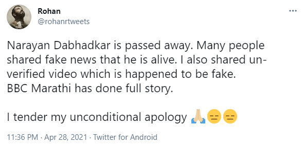 He also said that many people had shared another fake news that Narayan Dhabadkar’s death was being faked and that he is still alive. However, that is incorrect as Dhabadkar had indeed died, giving up medical facilities for someone else.