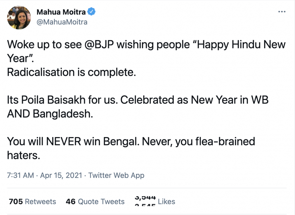 While Moitra wanted to paint everyone who was celebrating the Hindu new year as ‘radical’, the hate for Hindus was actually more evident in her tweet.