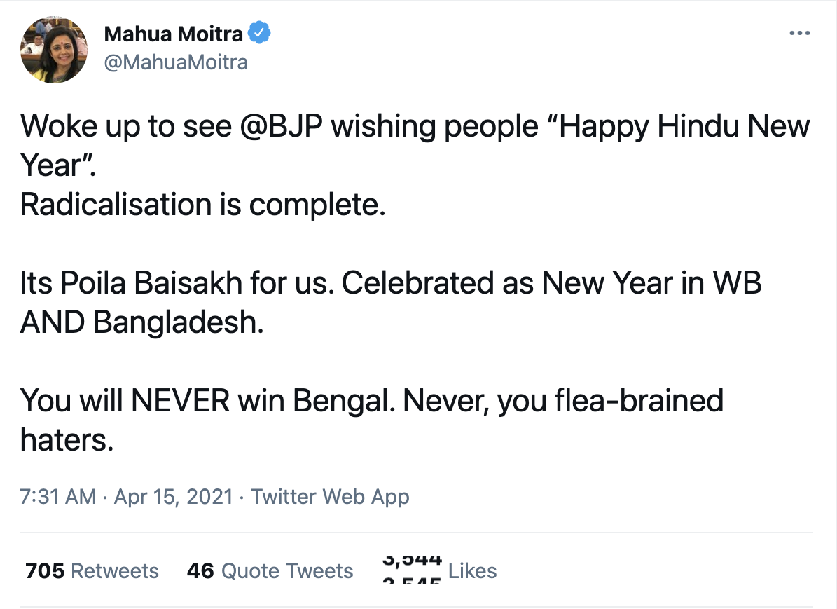 However, this seems to have triggered Moitra, who was upset that the BJP was wishing the Hindus for their new year. So much that she called the wishes as ‘radicalisation’.