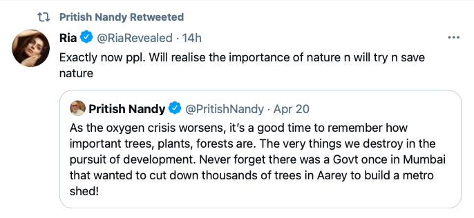 Pritish Nandy found a way to put evil Modi in his place today. Since Modi is making oxygen available, he should be grateful to remember how he and his evil government in Mumbai were trying to destroy the giant oxygen production plant in Mumbai called the Aarey forest. The subsequent ‘liberal’ self-glorification is not spelt out here, it is just implied. “See, we saved Aarey forest. Thank us for all the oxygen you all are breathing today.”