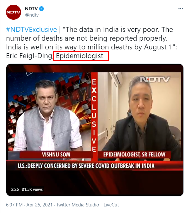 On Sunday (April 25), NDTV invited ‘epidemiologist’ Eric Feigl-Ding to discuss about the 2nd wave of Coronavirus in India.