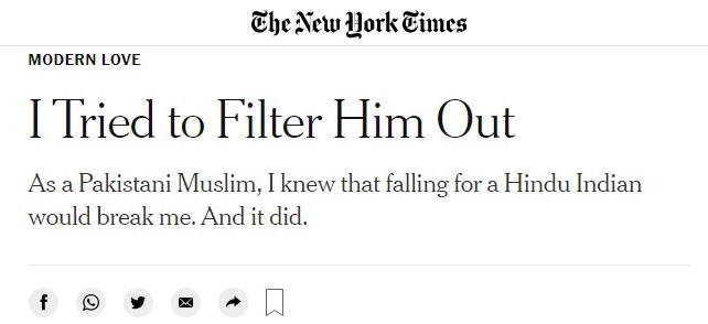 The New York Times on Friday provided platform to Islamic bigotry in a blog where the author narrates her ‘tragic’ love story. It is the story of a son who refused to abandon his parents and and that of a daughter who could not convince her parents to accede to her wish.