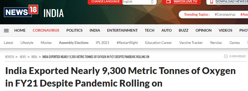 On April 20, 2021, Moneycontrol claimed that India exported nearly 9,300 metric tonnes of oxygen in first three months of 2021. Money Control did not specify whether the exported oxygen was medical oxygen, fit for patients, thereby adding to panic.