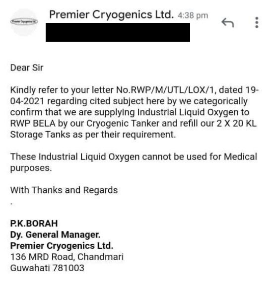 In a letter reffered to the Railway plant which wanted to use its industrial supply for medical purposes, PK Borah, Deputy General Manager, Premier Cryogenics Ltd. said, that Industrial Liquid Oxygen cannot be used for Medical purposes.