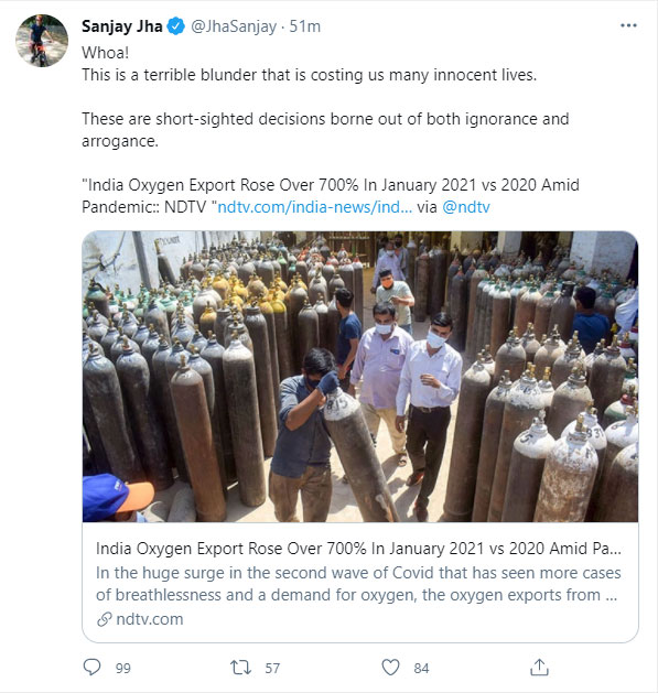 Malicious propaganda is being spread that India had exported scarce medical oxygen during the pandemic year of 2020-21. This is absolutely false and industrial oxygen exports are being mistaken as medical oxygen: Government sources