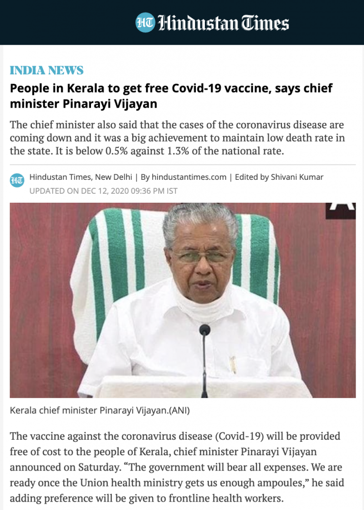 Kerala Chief Minister Pinarayi on Tuesday went back on his promise of making Chinese coronavirus vaccines free in his state. He appealed to the central government to instead foot the bill and make vaccines for those eligible from May 1 2021 free in his state. It is imperative to note that health is state subject and respective state governments are responsible for implementing policies framed by Centre.