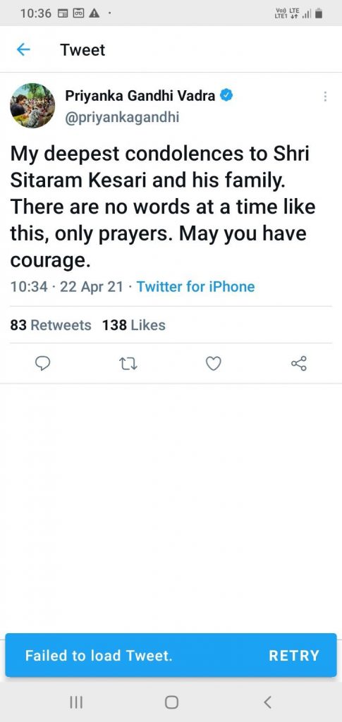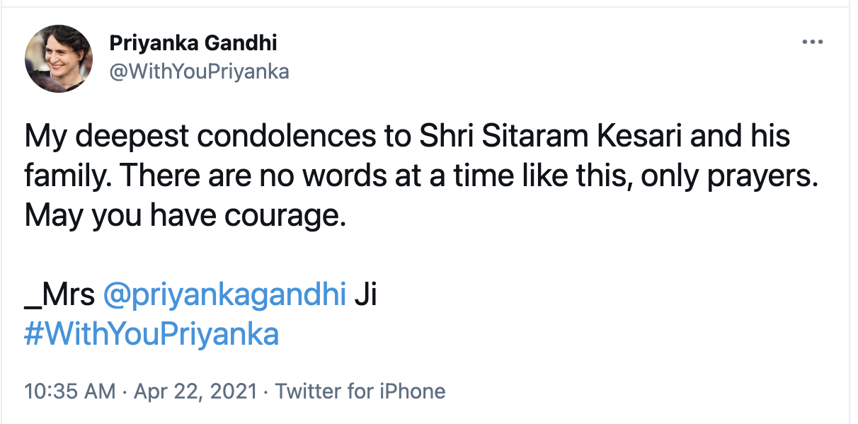 Soon, her social media team must have scrambled together and stepped in for the actual condolence message that should have gone up from Priyanka Gandhi’s account.